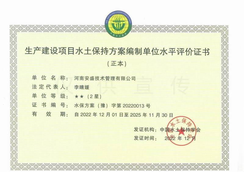 熱烈慶祝河南安盛技術管理有限公司榮獲生產建設項目水土保持方案編制單位水平評價證書